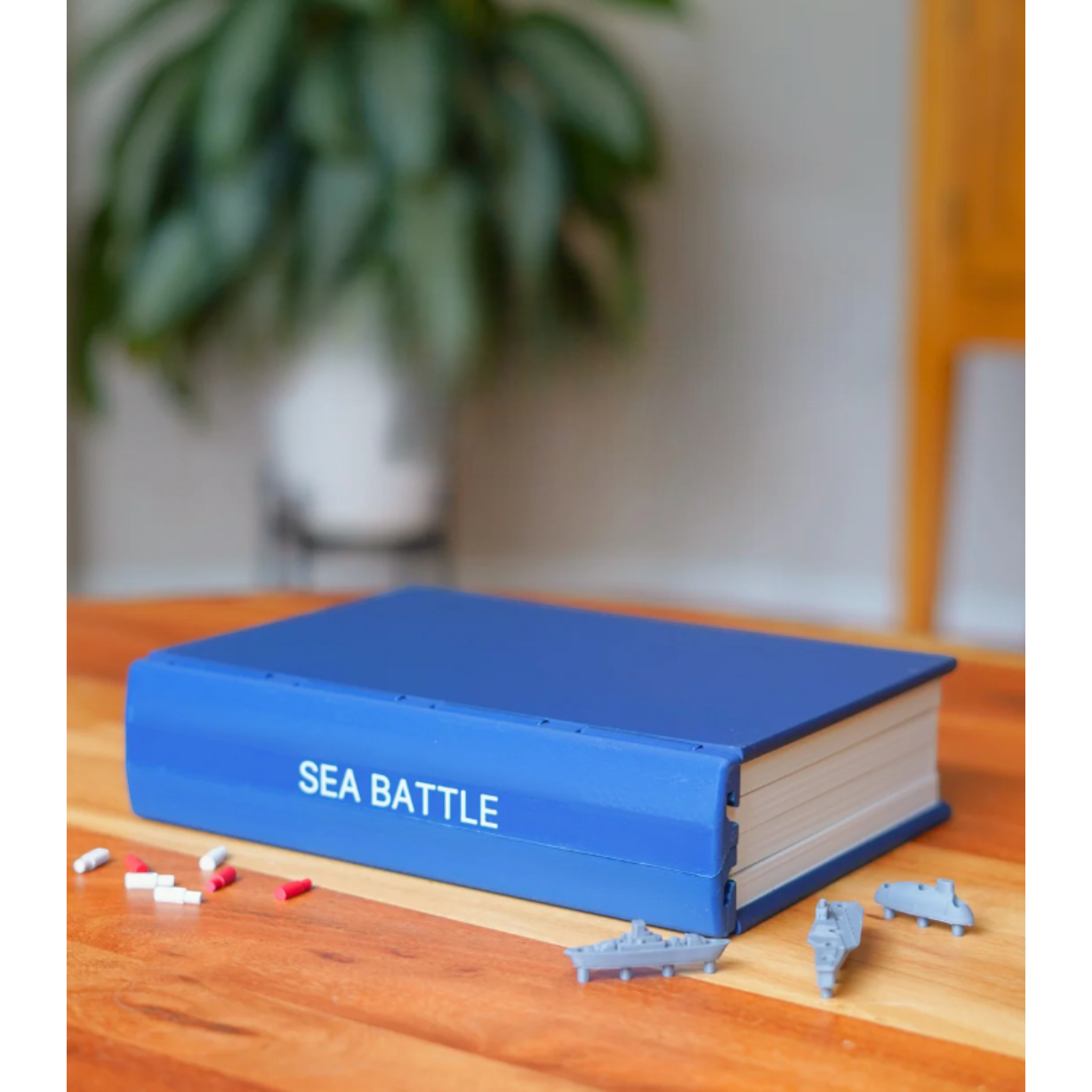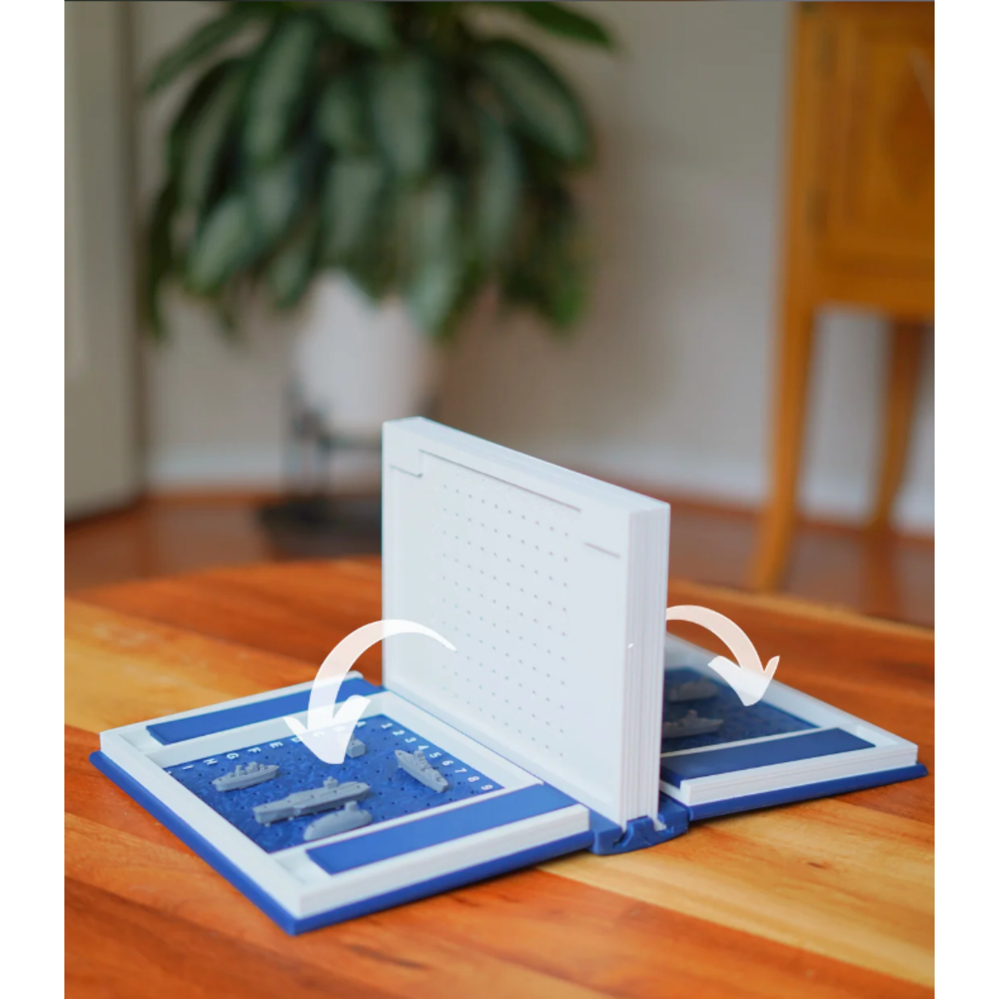 Strategie en spanning in boekvorm. Open het boek, plaats je vloot, en ga de strijd aan. Inclusief grijze schepen, rode/witte markers en opbergvakken.